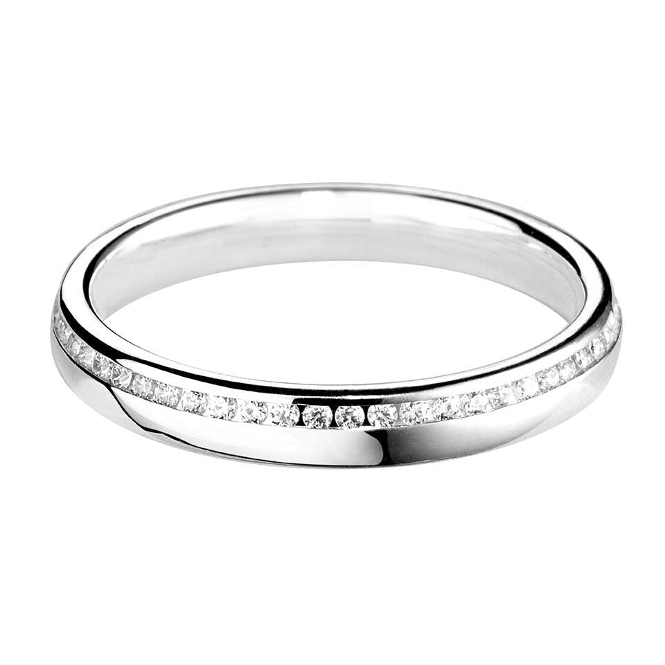 A COURT PROFILE WEDDING RING WITH OFFSET CHANNEL SET ROUND DIAMONDS AND A FINE EDGE.