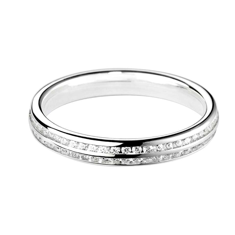 A COURT PROFILE WEDDING RING WITH DOUBLE ROW CHANNEL SET ROUND DIAMONDS AND A FINE EDGE.